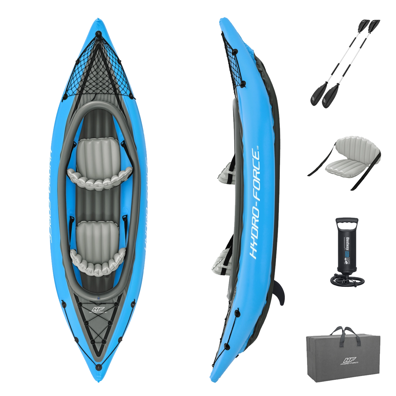 U pakiranju dobivate kajak za 2 osobe, dvije dvostruke vesla, ručnu pumpu Air Hammer, odvojivu peraju/skeg, zakrpu za popravak i prijenosnu torbu – spremni ste odmah krenuti.