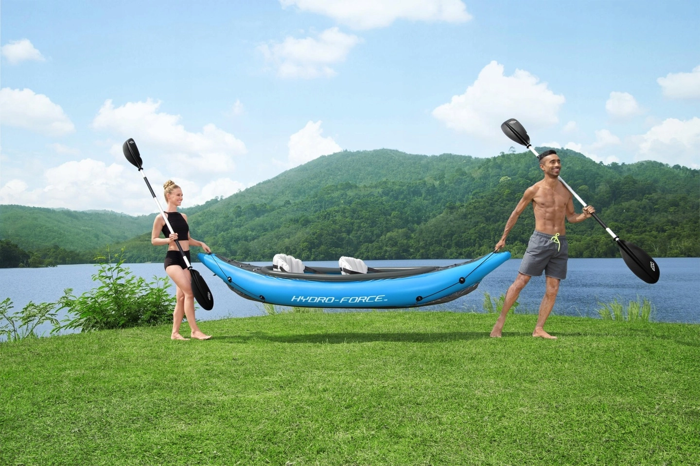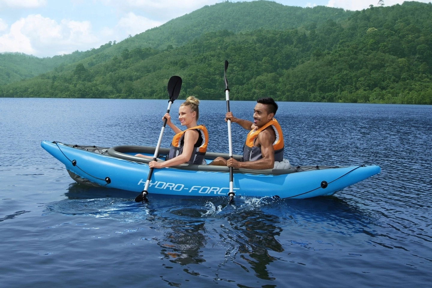 Nafukovací kajak Hydro‑Force Cove Champion X2 idealan je za rekreativno veslanje po jezerima i mirnim rijekama. U pakiranju se nalazi sve što vam treba: 2 dvostruka vesla, ručna pumpa Air Hammer, 2 podesiva nafukavajuća sjedala s naslonom i transportna torba. Robusna višeslojna konstrukcija s čvrstim nafukavajućim dnom osigurava stabilnost i sigurnost na vodi.
