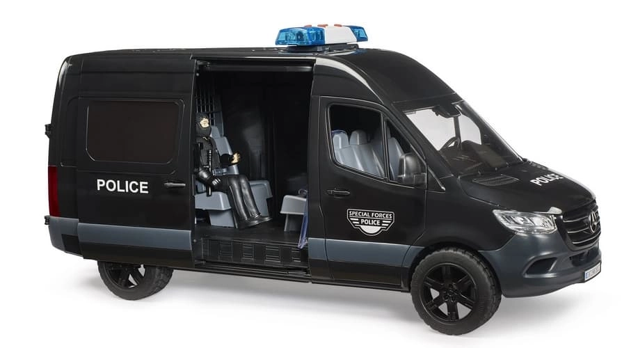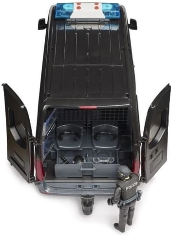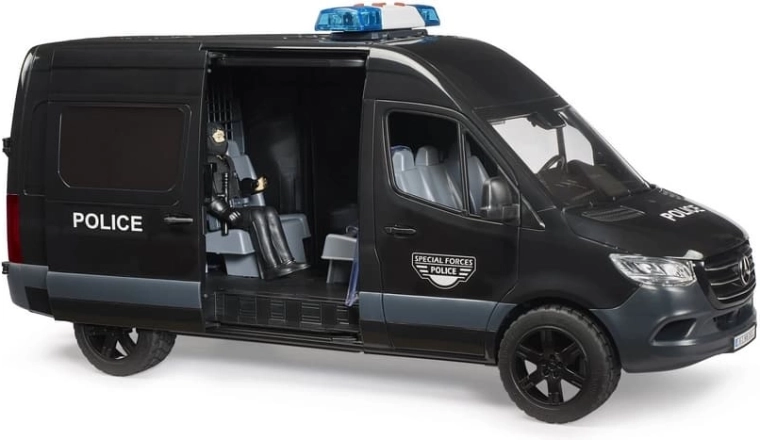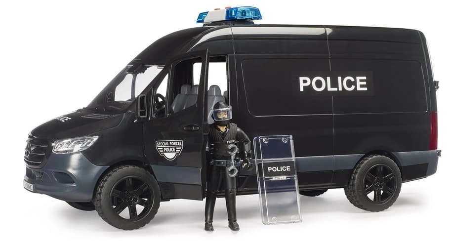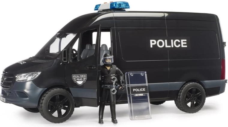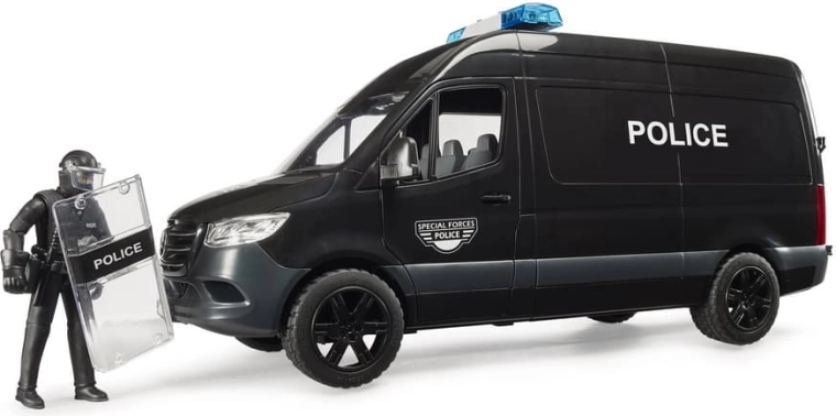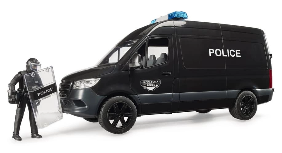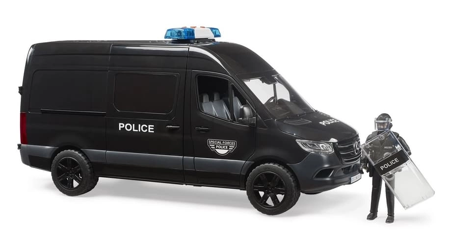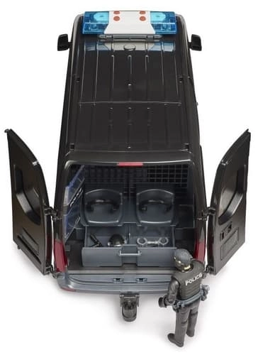 Realistično izrađen model policijskog vozila MERCEDES‑BENZ Sprinter donosi djeci autentične scenarije igre s interventnom jedinicom. Vozilo ima klizna bočna vrata, otvorivu kabinu i prozirne prozore od izdržljive plastike. U kompletu je figurica interventnog policajca sa štitom i dodatcima za akcijsku igru uloga.