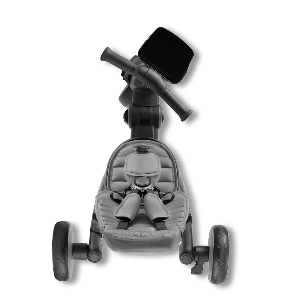 Podesivi trodijelni pojasevi, odvojiva sigurnosna prečka i stražnja kočnica štite malog vozača, dok mekano sjedalo i krović osiguravaju udobnost.