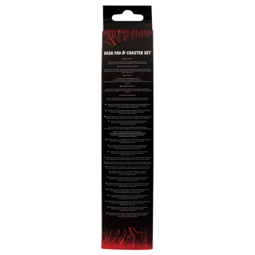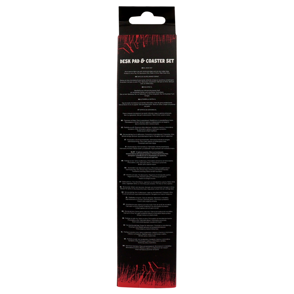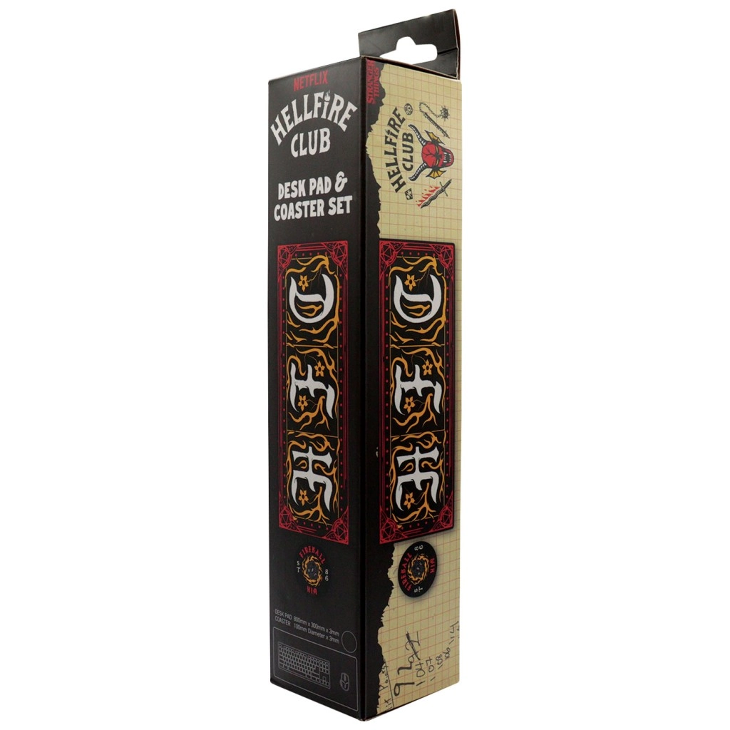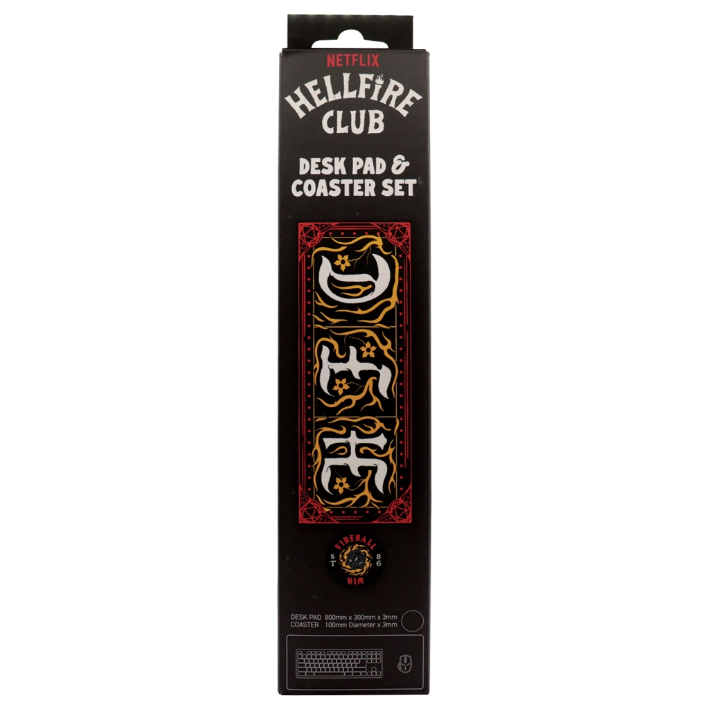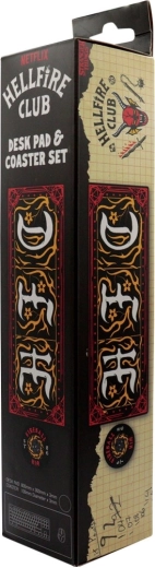 Unaprijedite svoj gaming ili radni kutak kultnim setom STRANGER THINGS Hellfire Club. Pravokutna stolna podloga pruža mekanu, ali izdržljivu površinu za miš, tipkovnicu i dodatke te istodobno štiti stol od ogrebotina. Okrugli podmetač u istom motivu drži napitke pri ruci bez ostavljanja krugova.