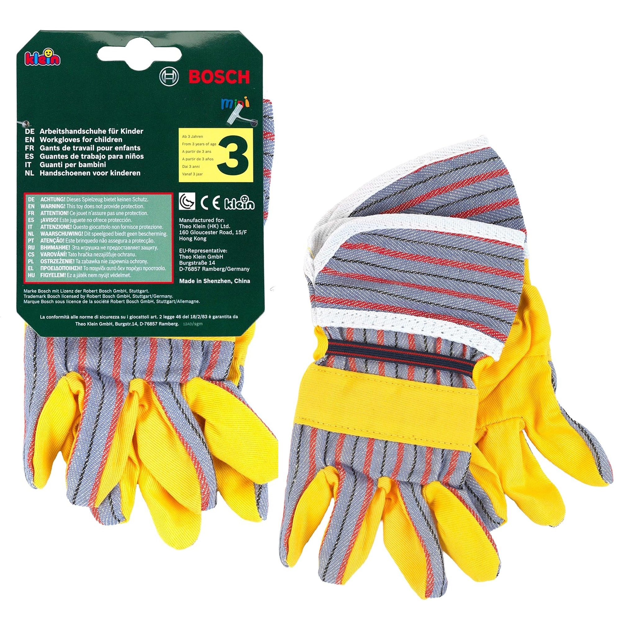Dječje radne rukavice BOSCH marke Klein izvrstan su dodatak za male majstore. Vjerno oponašaju prave rukavice, imaju žute dlanove sa sivim prugastim elementima, elastične manšete za bolje prianjanje i idealne su za igru uloga majstora i vrtlara.