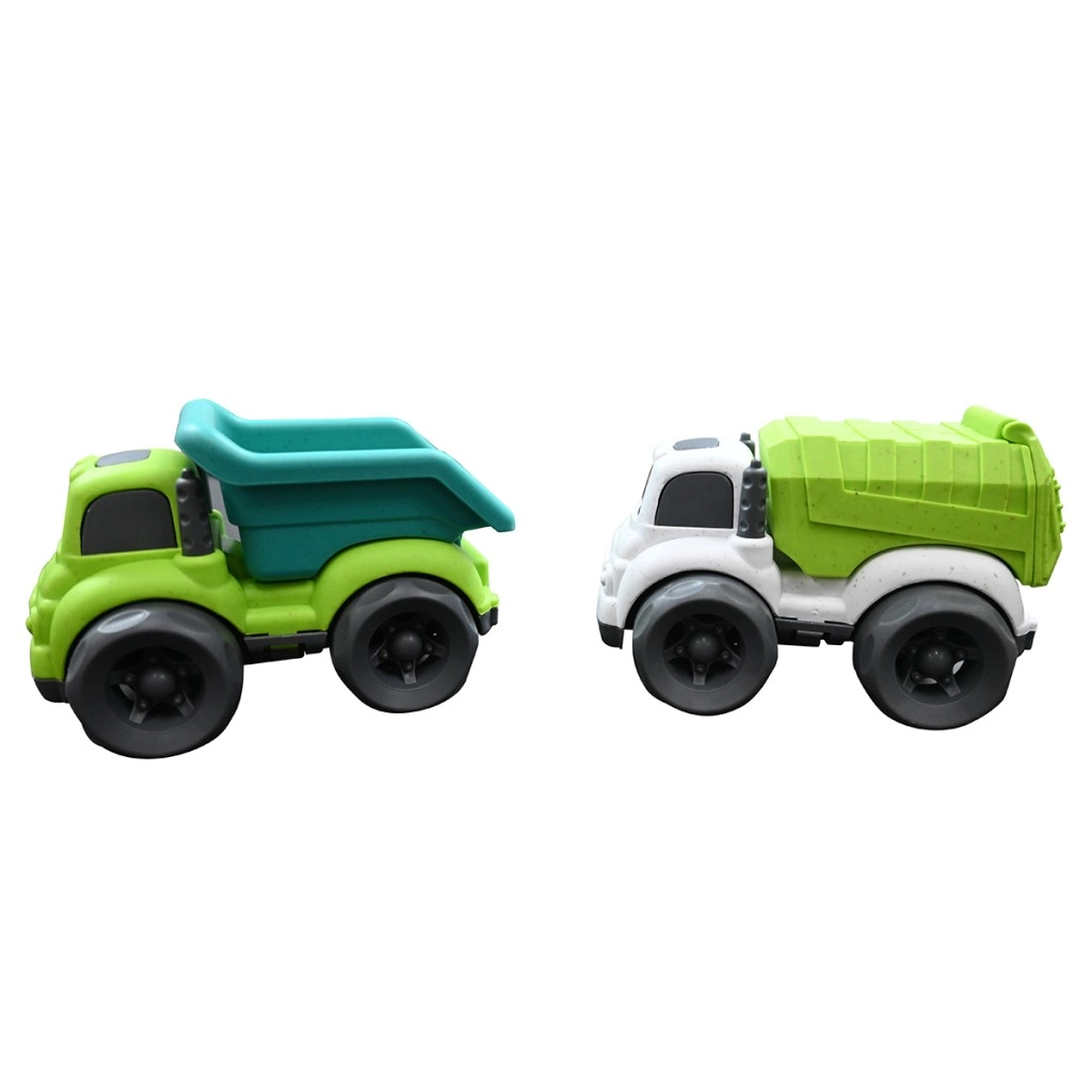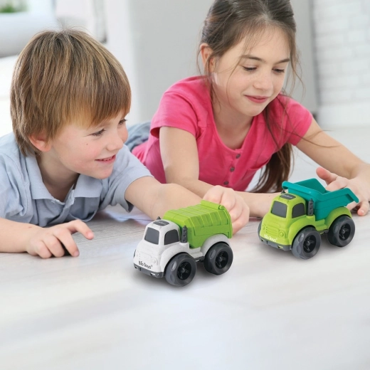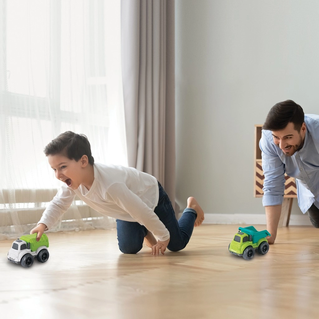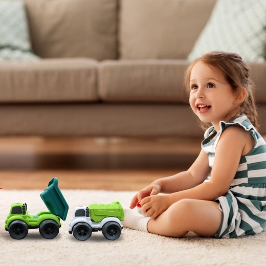 Ovaj ekološki set sadrži dva čvrsta kamiona u privlačnim bojama – jedan sa zeleno–tirkiznom kadicom i drugi s bijelim okvirom i jarko zelenim tovarnim prostorom. Zahvaljujući velikim kolima glatko klize po podu i lako se upravljaju i najmanjim ručicama. Funkcionalna nagibna kiper-kadica potiče igru uloga, gradnju, prijevoz „tereta” i prirodan razvoj dječje mašte.