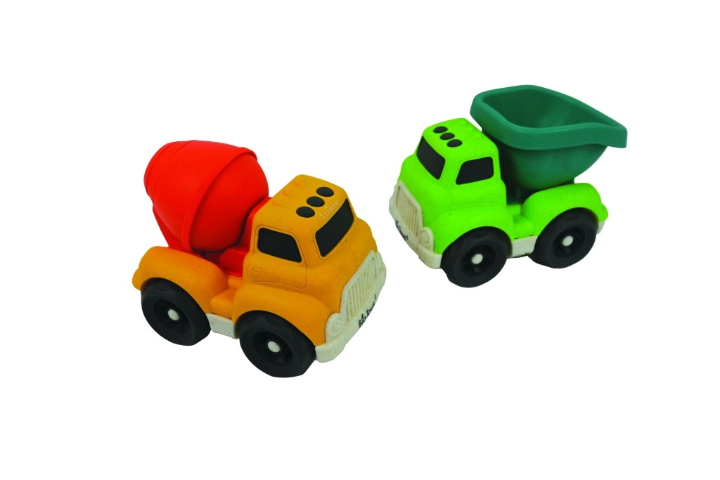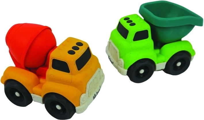 Set sadrži žuto vozilo s crvenom miješalicom za beton i zeleni kiper s modrozelenom karoserijom. Površina igračaka je mat i ugodna na dodir, veliki kotači osiguravaju glatku vožnju, a obli rubovi sigurno držanje i za male ruke. Zahvaljujući kompaktnoj formi vozila se lako upravljaju i odolijevaju čestoj uporabi.