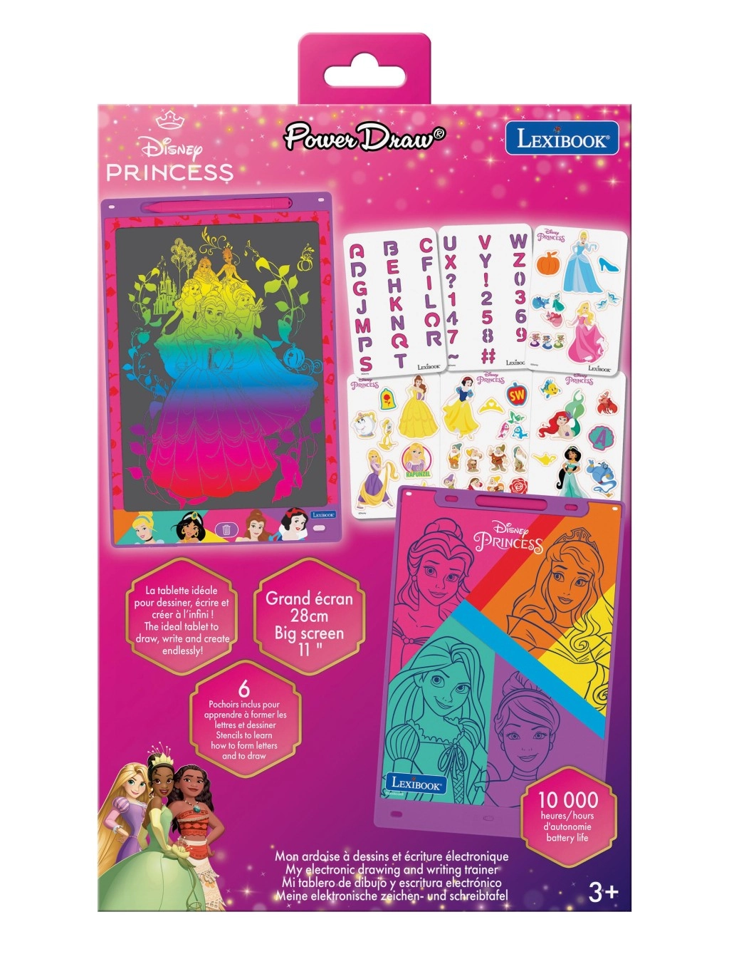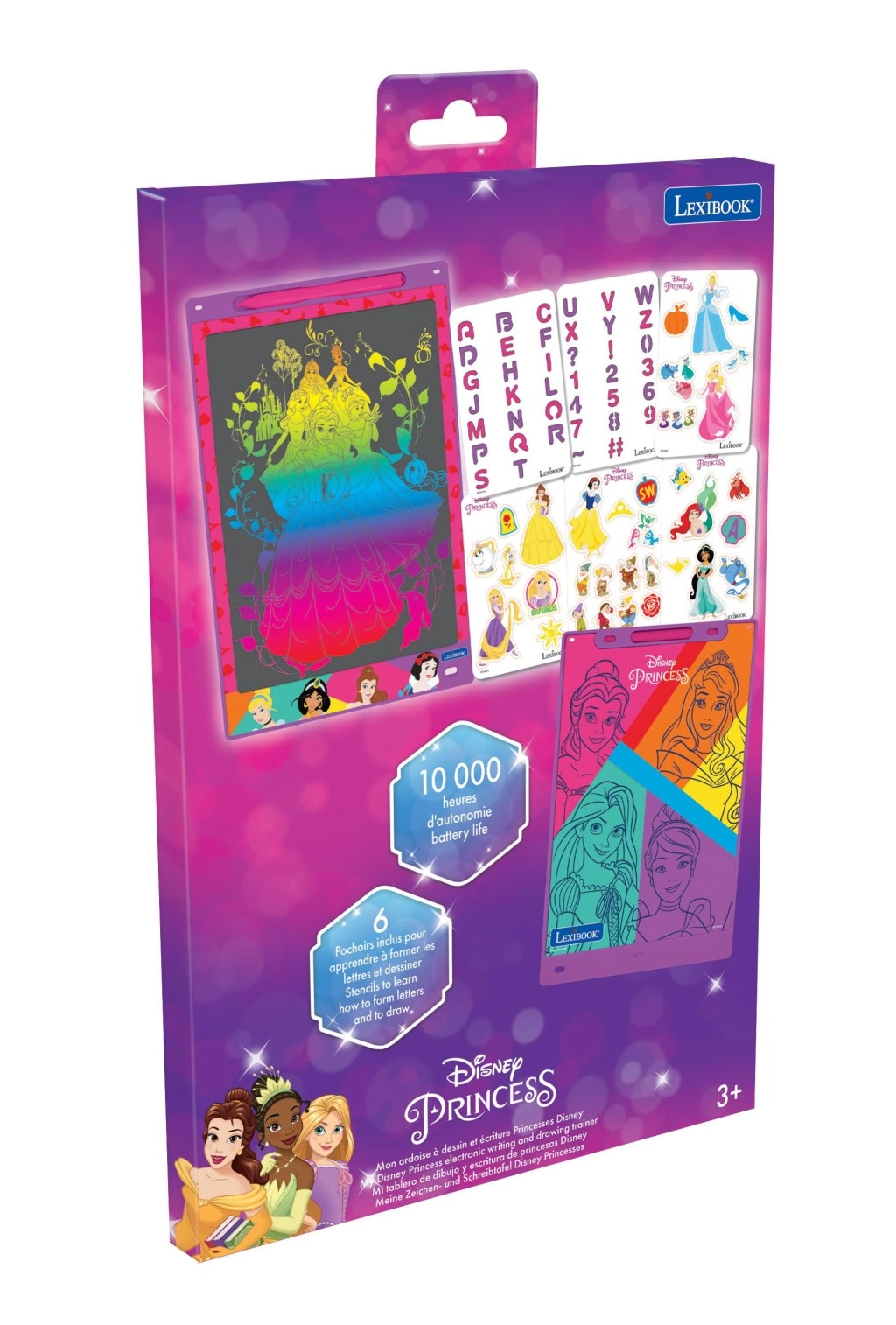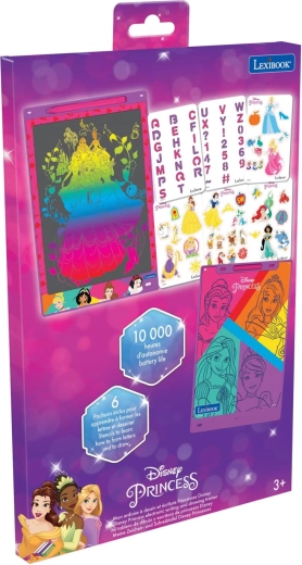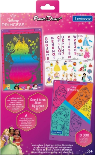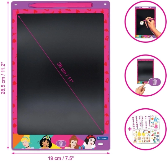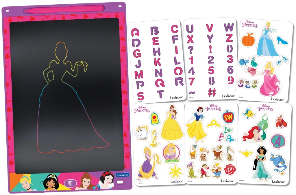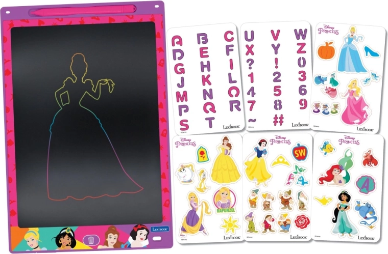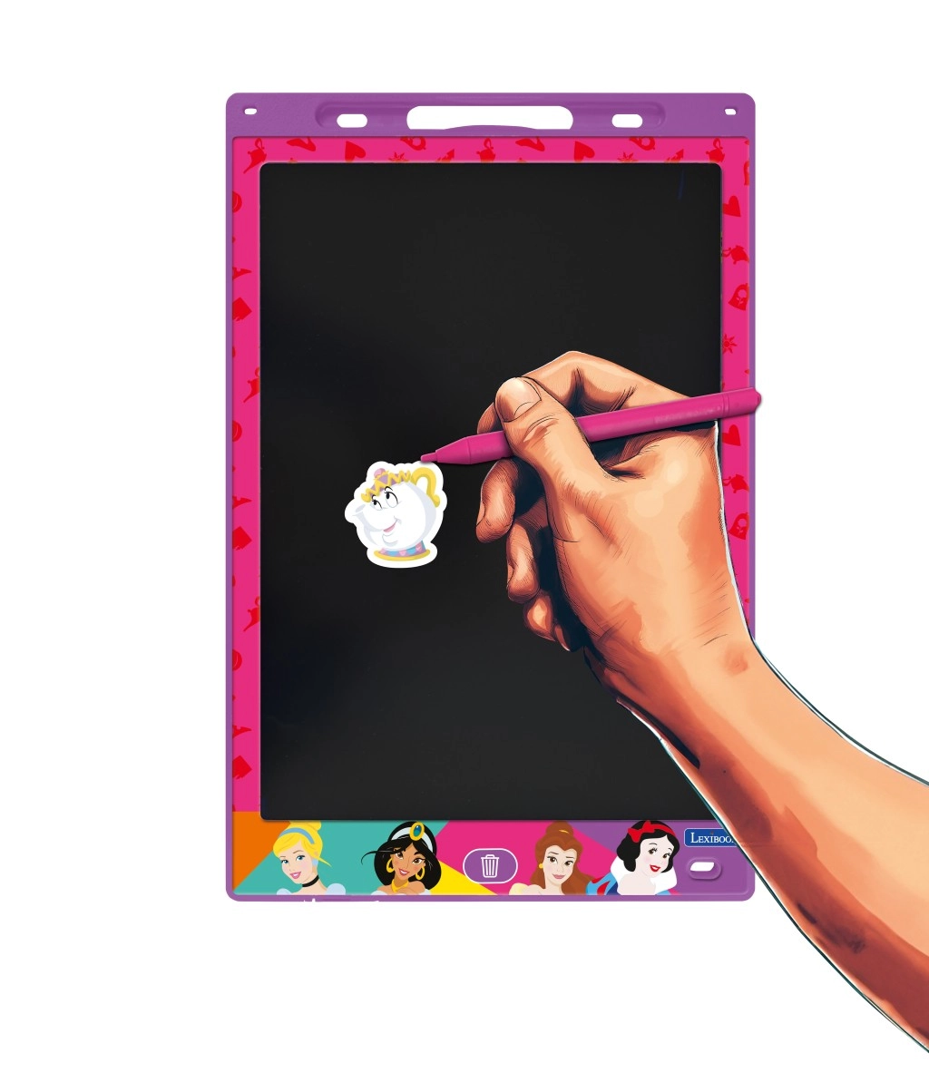 Dio pakiranja su tematske šablone s princezama, slovima i brojkama koje pomažu pri vježbanju pisanja te kreativnom bojanju i precrtavanju. Jednim pritiskom gumba s ikonom koša djeca lako obrišu zaslon i krenu ispočetka – bez papira i nereda.