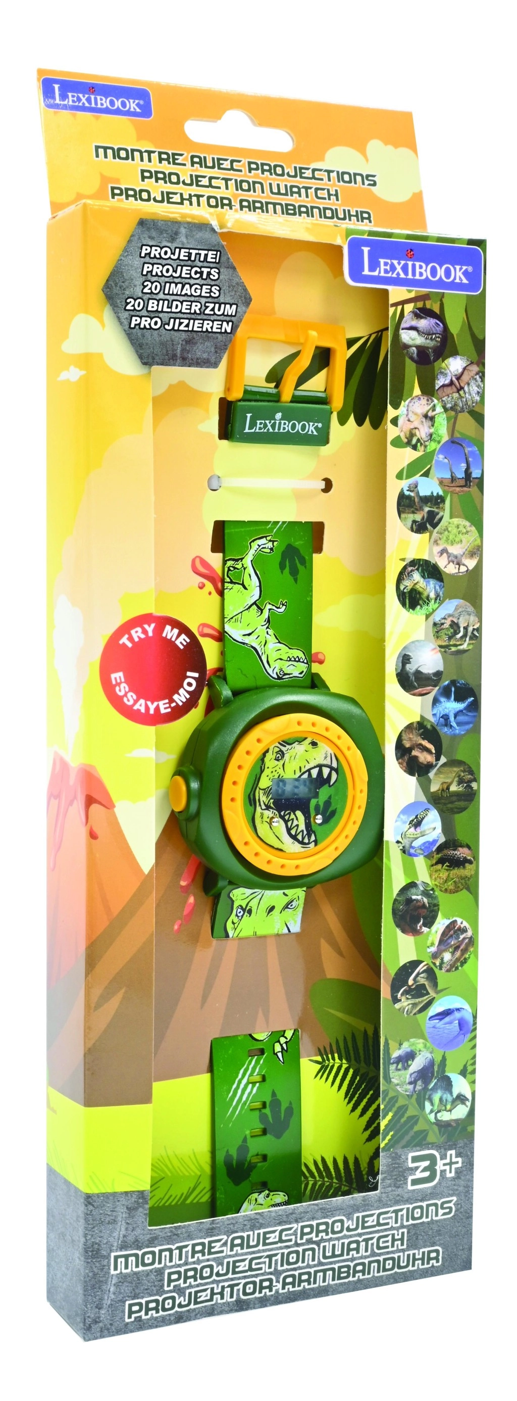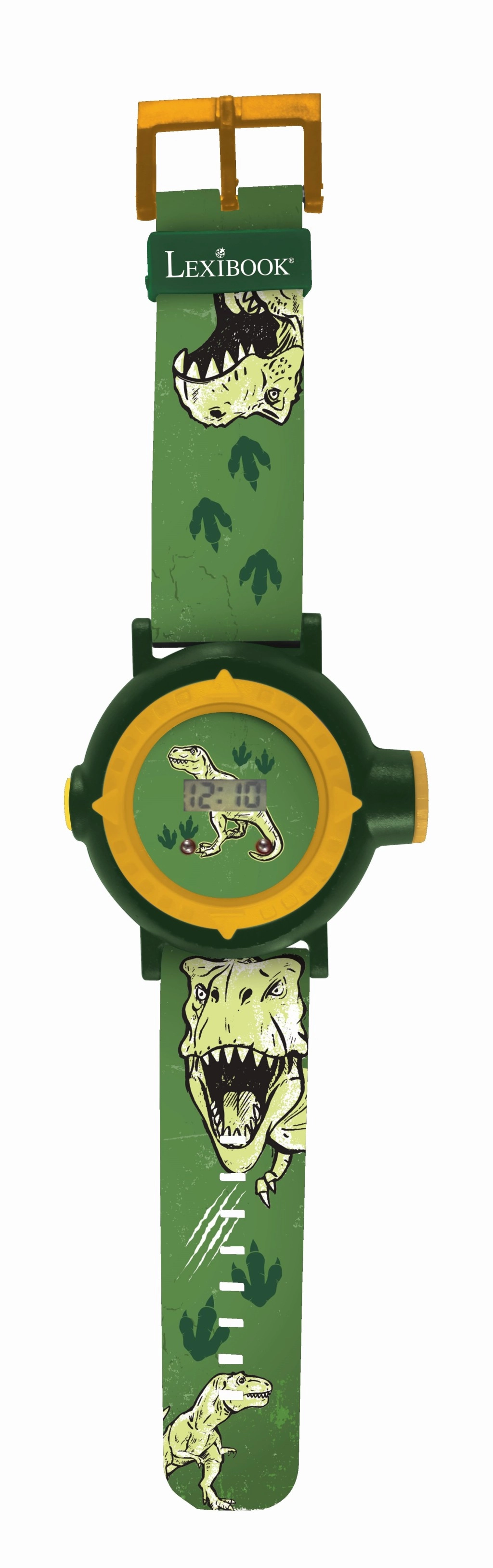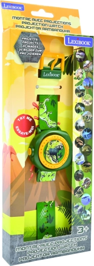 Otkrijte dječji digitalni sat Lexibook s tematikom dinosaura koji zabavlja i educira. Zahvaljujući projektoru s 20 snimaka dinosaura prapovijesni svijet prenosi se na zid ili stol jednim pritiskom na gumb. Izdržljivo plastično kućište u tamnozelenoj boji sa žutim prstenom i udoban, podesivi remen s T-Rex motivima savršeno pristaju manjem zapešću.