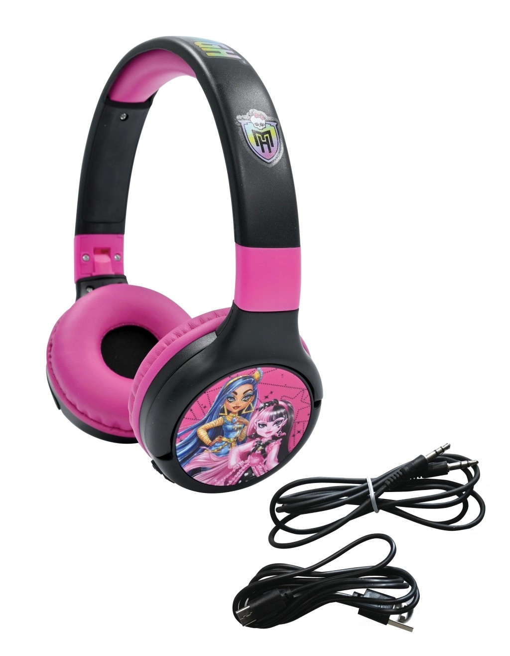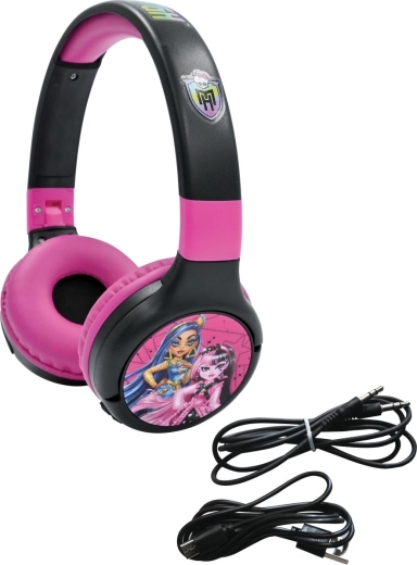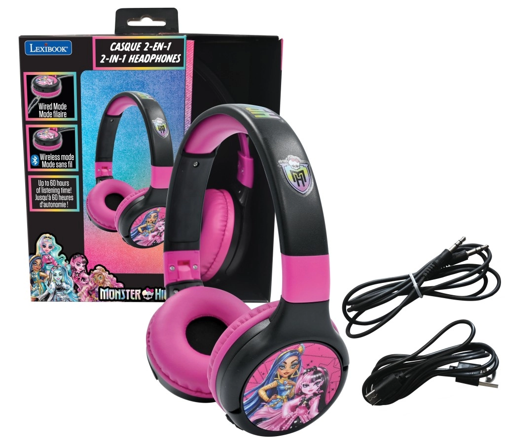 Razveselite djecu slušalicama Lexibook MONSTER HIGH koje spajaju sigurnost, udobnost i zabavu. Zahvaljujući bežičnoj Bluetooth tehnologiji moguće je slušati glazbu bez kabela, a kada zatreba, dovoljno je priključiti priloženi audio kabel. Sklopivo kućište olakšava nošenje u ruksaku, a upečatljiv ružičasto-crni dizajn s junakinjama MONSTER HIGH dodaje stil.
