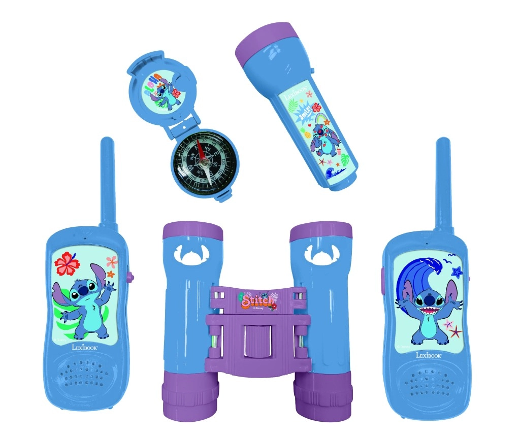 Uz ovaj tematski set LEXIBOOK STITCH djeca kreću u vlastite pustolovine. Par dječjih walkie-talkie uređaja potiče timsku igru i komunikaciju, dalekozor približava detalje prirode, baterijska svjetiljka osvjetljava svaki kutak, a kompas pomaže u orijentaciji. Sve u ujednačenom plavo‑ljubičastom dizajnu s motivima STITCH i natpisom “Aloha” na kompasu.
