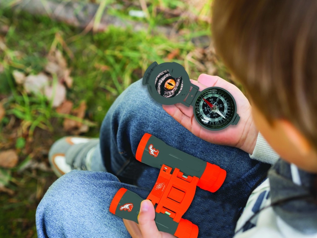 Avanturistički set za male istraživače od 3 godine spaja dva voki-tokija s dometom do 120 m, sklopivi dalekozor, kompas i kompaktnu baterijsku svjetiljku u izdržljivom izdanju s motivima dinosaura. Robusna plastika, jednostavno rukovanje i zaigran dizajn u tamnim bojama sa svijetlonarančastim detaljima potiču maštu, poboljšavaju komunikaciju i orijentaciju na terenu – kod kuće i vani.