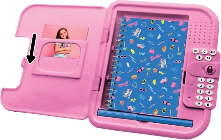 Unutra se nalazi spiralna bilježnica i olovka, pa je dnevnik spreman za trenutačnu upotrebu. Integrirani zvučnik, tipkovnica s brojkama i funkcijskim tipkama te praktični pretinci čine ga savršenim poklonom za male spisateljice i kreativke.