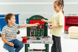 Ovaj potpuno opremljen radni stol za djecu s licencom BOSCH pretvara sobu u malu radionicu. Pregledno odlaganje omogućuje perforirana stražnja stijenka s kukama, polica ispod ploče i 3 praktične kutije za sitnice. Tu je i funkcionalna dječja stega za čvrsto učvršćivanje dijelova i stabilna radna površina.