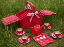 Očaravajuća piknik košara s motivima točkica i srdaca skriva limeni čajni servis spreman za svaku zamišljenu čajanku. Čvrsta izrada s podesivim trakama na čičak i tekstilnim rubom osigurava jednostavno prenošenje i spremanje svih dijelova. Djeca vježbaju društvenu interakciju, motoriku i kreativnost.
