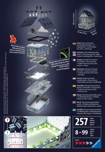 Uđite u tajanstveni svijet gdje svaki dio pristaje s tipičnom preciznošću Ravensburgera. Nakon sastavljanja pred vama se pojavljuje detaljno izrađena sablasna kuća, koja u sumraku oživi zahvaljujući glow-in-the-dark efektu. Idealno kao poklon za ljubitelje zagonetki i tematskih dekoracija.