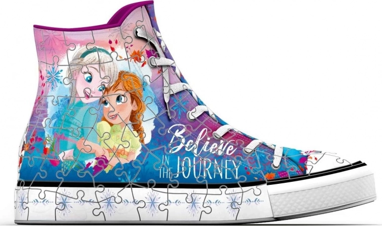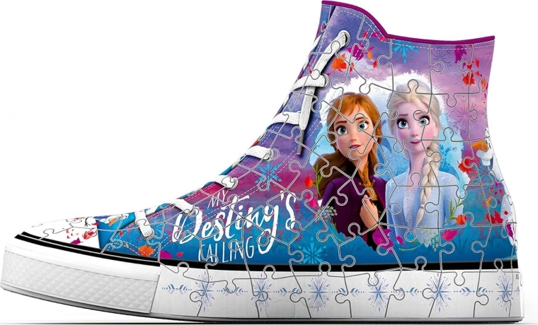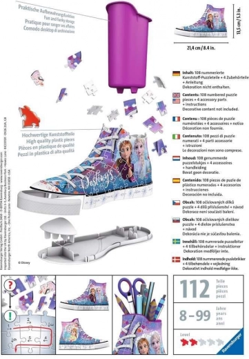 Genijalni spoj zabave i praktičnosti: 3D puzzle u obliku visoke tenisice s omiljenim junakinjama iz filma Frozen 2. Zahvaljujući čvrstim plastičnim dijelovima sastavit ćete izdržljivu dekoraciju koja služi kao držač za olovke, bojice i škare – bez ljepila, jednostavno i s izvrsnim rezultatom.