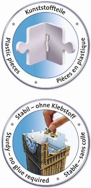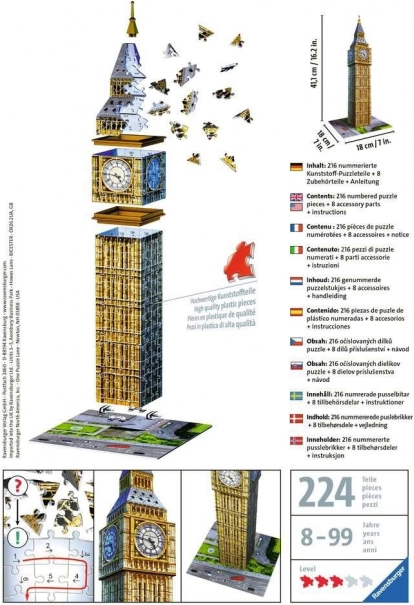 Set sadrži ukupno 216 numeriranih dijelova puzzle, 8 komada pribora i detaljne upute. Nakon sastavljanja, puzzle je približno veličine 18 x 18 x 41 cm. Ovaj model je idealan kako za ljubitelje tvrtke Ravensburger, tako i za one koji vole arhitekturu i London.