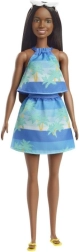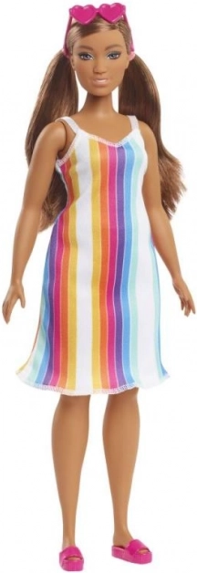 Lutka ima stilski ljetni outfit s bojama i uzorcima inspiriranim plažom.