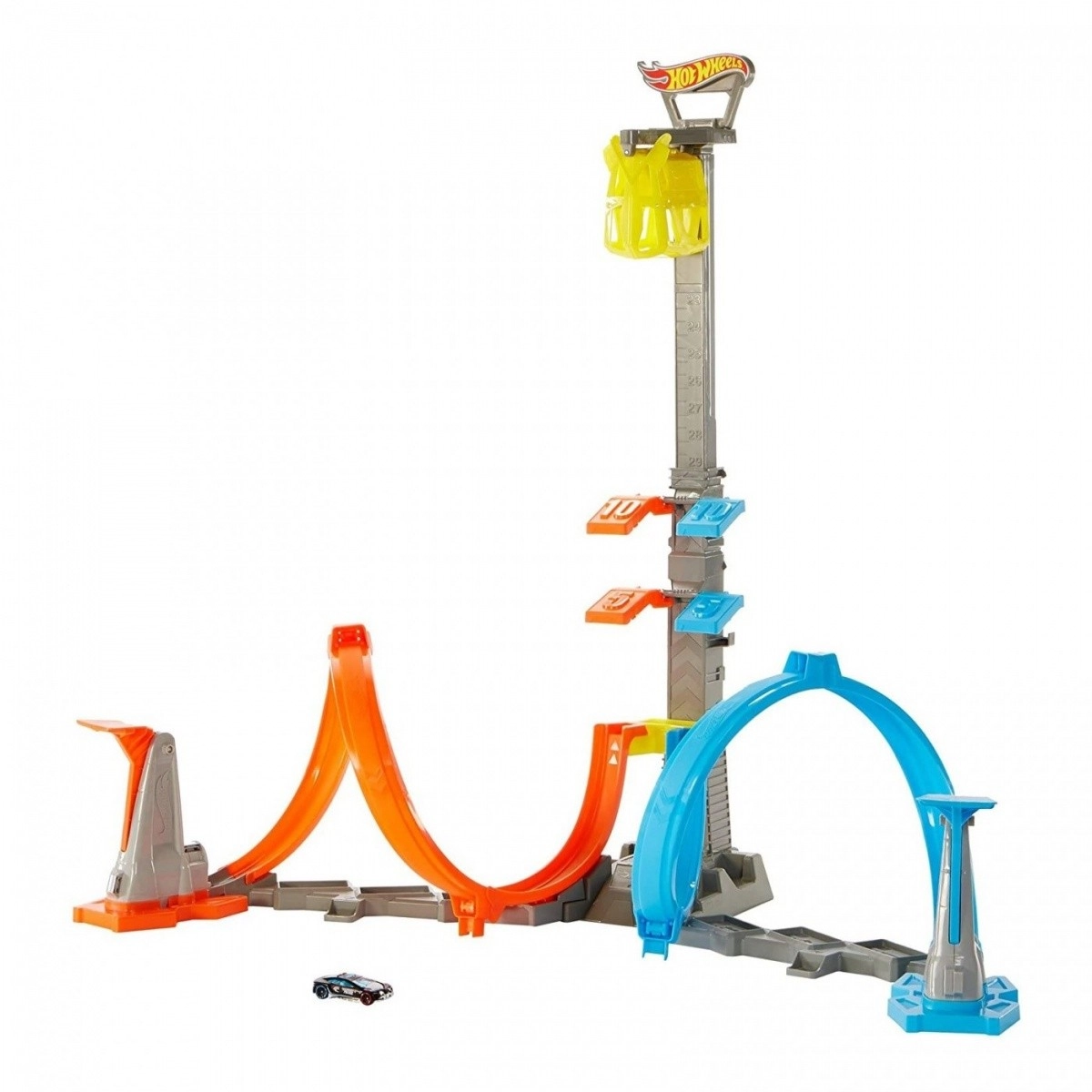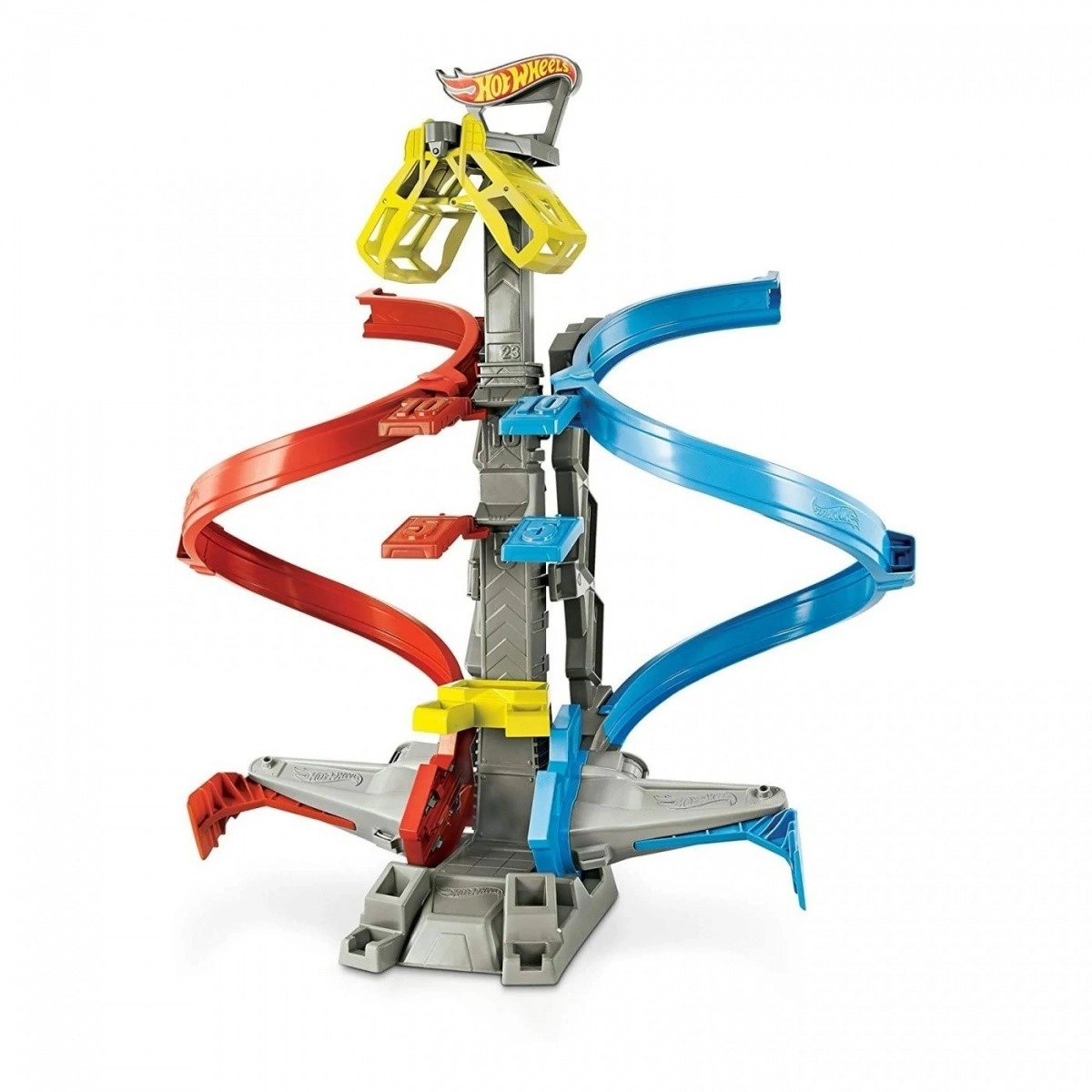 Podignite zabavu utrkivanja uz HOT WHEELS Toranj – Dvoboj na visini, dinamični set u kojem autići lete kroz zavijene petlje i jure prema podesivo visoko postavljenom kavezu pobjednika. Čim prvo vozilo prođe cilj, kavez se zatvara i okrunjuje šampiona. Zahvaljujući bodovnim panelima na stazi svaki je pokušaj napetiji i motivira djecu na daljnji trening.