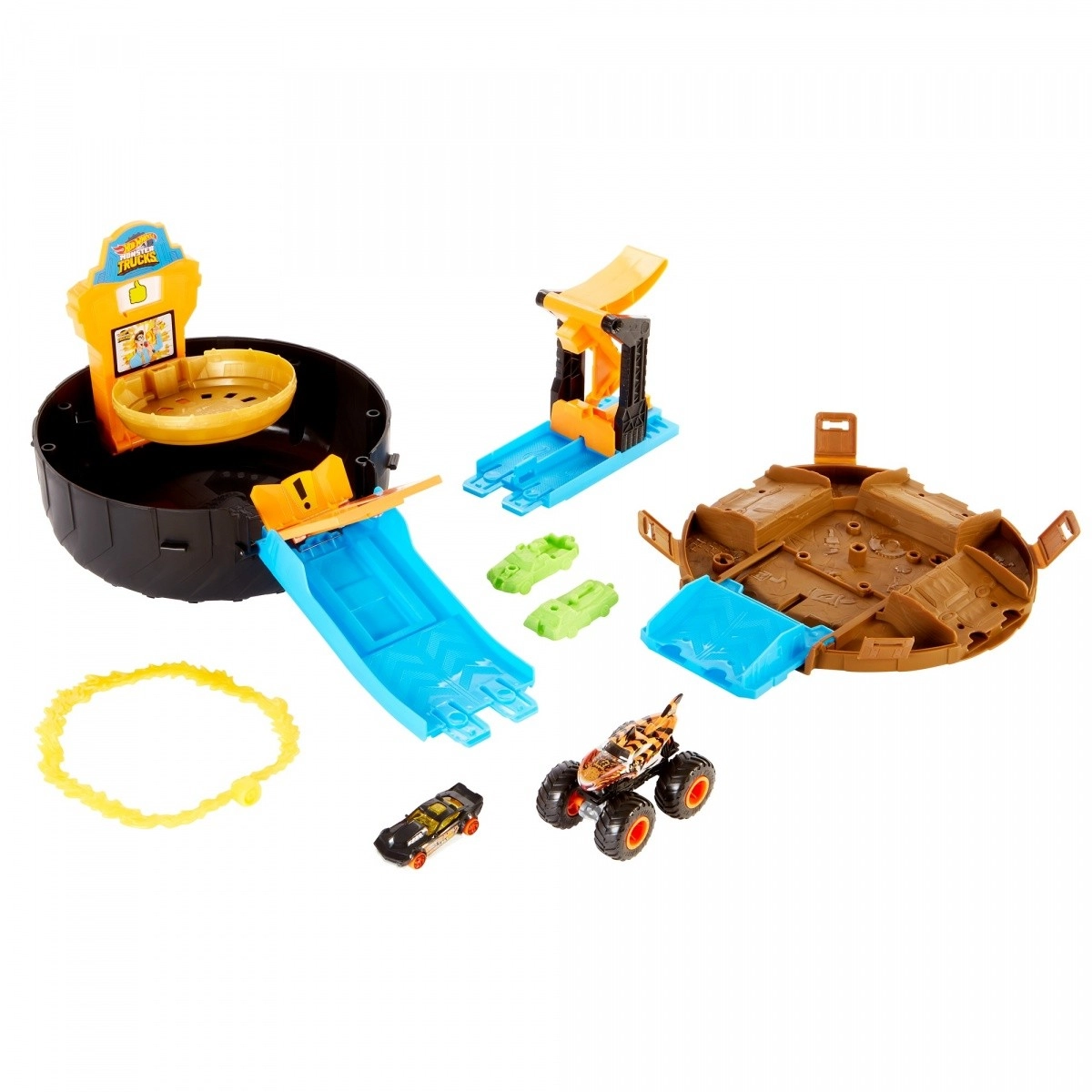 Prijenosna kaskaderska arena u obliku divovske gume od Hot Wheels Monster Trucks donosi epske skokove, sudare i natjecanje bilo gdje. Set nakon rasklapanja mjeri oko 89 cm, sadrži lansirnik za 2 autića ili 1 monster truck, vatreni prsten, ploču za rezultat i platformu pobjednika. U kompletu su Monster Truck Tiger Shark i autić Hot Wheels 1:64.