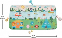 Podloga dimenzija približno 152 × 81 cm nudi dovoljno mjesta za valjanje, vrijeme na trbuščiću i zajedničku igru s roditeljima. Šareni kamping motiv potiče maštu i istraživanje.