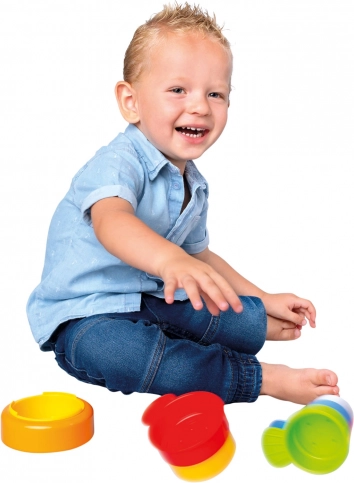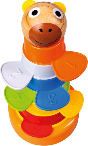 Ova vesela kula spaja igru i učenje u jednom. Šest šarenih posudica slaže se na stabilnu podlogu, a upotpunjuje ih drvena kuglica u obliku medvjedićeve glave. Djeca elemente mogu ne samo slagati, već ih i umetati jedan u drugi, razvrstavati po veličini ili boji te upoznavati prve brojeve.