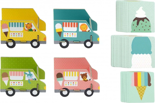 Sladokusci, ujedinite se! Pametna i zabavna kartaška igra u kojoj slažete sladoledne kornete, skupljate kuglice i dodajete posip. Sadrži 52 ilustrirane karte i 4 sladoledna vozila, idealna je za 2–4 igrača, traje otprilike 10 minuta i izrađena je od recikliranih materijala s biljnim tintama. Sjajan izbor za djecu od 4 do 8 godina i udovoljava svim sigurnosnim standardima.