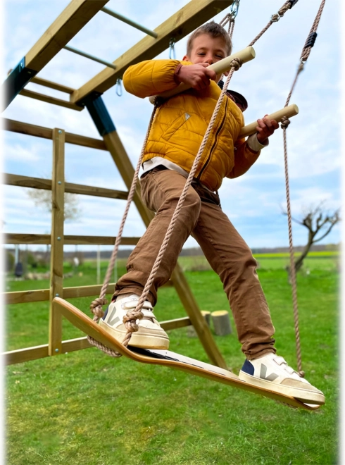 Ova netradicionalna njihaljka spaja zabavu i razvoj motorike. Daska od čvrste šperploče sa zakrivljenim rubovima i podesive ručke od masivnog drva omogućuju djeci sigurno vježbati ravnotežu, koordinaciju i stabilnost. Zahvaljujući protukliznoj površini ljuljanje u stojećem položaju je sigurnije i udobnije.