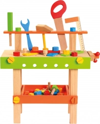 Sastavni dio je 9‑dijelni stol sa stegom, 5 komada alata i 36 građevnih dijelova. Šareni vijci, matice i spojnice potiču učenje boja i oblika, kao i koordinaciju oko–ruka. Prostor za pohranu pomaže održavati red i potiče djecu na samostalnost.
