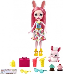 Lutka Bree s dugom ružičastom kosom i zečjim ušima spremna je za putovanje. Njezina odjeća uključuje ljetnu haljinu s cvjetnim printom, cipele i sunčane naočale.