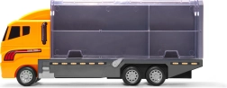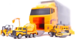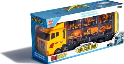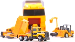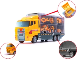Veliki set za male graditelje: robustan tegljač s prozirnim poklopcem služi kao organizator i transporter za 6 mini građevinskih strojeva (bager, utovarivač, miješalica itd.). Zahvaljujući poklopcu koji se otvara i izvlakoj rampi autići lako izlaze pritiskom na gumb. Igračka je od izdržljive ABS plastike, ima realistične detalje i laka je za prenošenje – idealna za dom, putovanja i vrtić.
