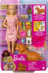 Dodatni dodaci, poput nosiljke za sva tri psića, bočica, dvije četke, igračka, dvije poslastice, vreća 'hrane' i zdjela, proširuju mogućnosti igre i njege. Ovaj komplet je izvrstan poklon za djecu od 3 do 7 godina koja vole životinje. Lutka Barbie ne može samostalno stajati. Boje i ukrasni elementi mogu se razlikovati.