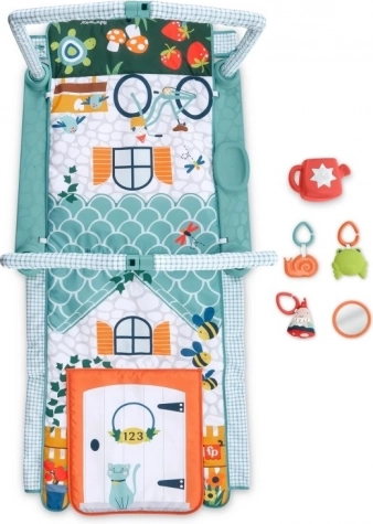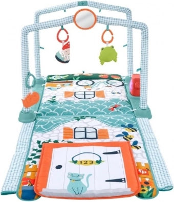 Univerzalna igraća podloga Fisher-Price 3-u-1 Istraživačka kućica raste s bebom od rođenja: nudi igru na leđima, vrijeme na trbuščiću i tunel za puzanje i gmizanje. U kompletu je 5 visećih igračaka, uključujući zrcalce i grickalicu, te elektronička kanticа s lampicama i glazbom do 20 minuta. Mekana podloga je periva u perilici i potiče razvoj osjetila, finu motoriku i koordinaciju.