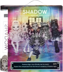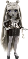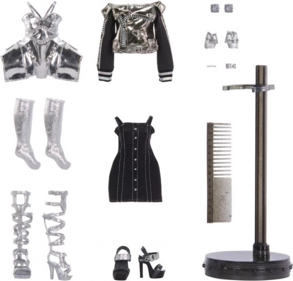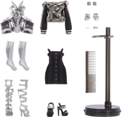 Uključena je stilska odjevna kombinacija u nijansama sive, crne i srebrne, dopunjena cipelama, nakitom i postoljem. Bogat set dodataka potiče maštovitu igru, kombiniranje stilova i kolekcionarsko izlaganje. Uronite u suparništvo škola RAINBOW HIGH i SHADOW HIGH i kreirajte vlastite modne scenarije.