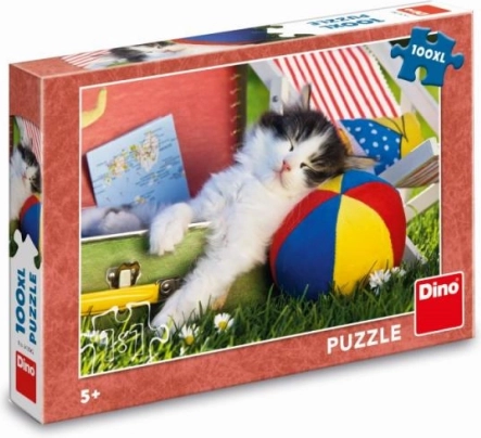 Šarena slika uspavanog mačića s loptom motivira djecu na slaganje i ukrašava svaku dječju sobu.