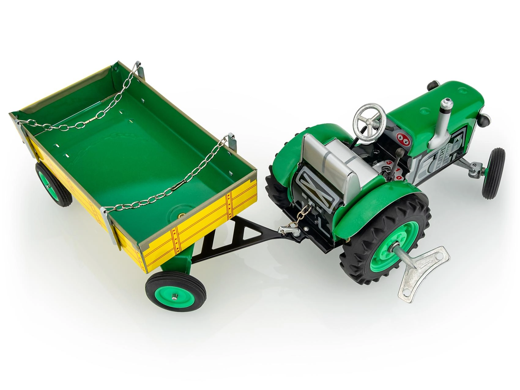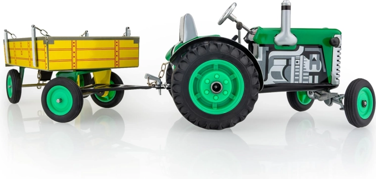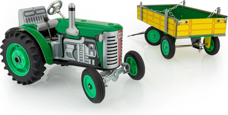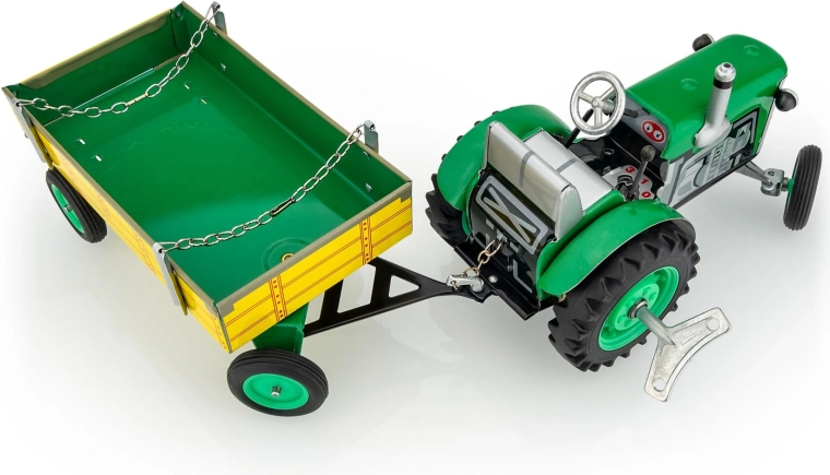 Metalni traktor Zetor s prikolicom marke KOVAP oduševit će male i velike ljubitelje poljoprivredne tehnike. Pogon osigurava opružni mehanizam na ključ, tu su i funkcionalni mjenjač s 3 brzine naprijed i rikvercom, upravljanje volanom te ručna kočnica. U mjerilu 1:25 i duljini 28 cm nudi autentičan doživljaj vožnje i kolekcionarsku vrijednost.