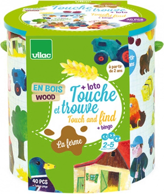 Igra Vilac Opipaj i pronađi - Farma idealna je za razvoj fine motorike i osjetljivosti opipa kod djece. Igrači moraju prema osjećaju pogoditi koji se predmeti nalaze unutar kante. Za stariju djecu igra nudi varijantu loto ili bingo s priloženim slikovnim karticama predmeta.