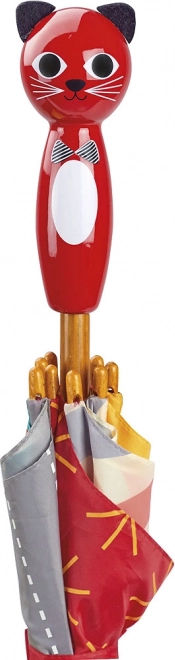 Naš dječji kišobran nosi razigrane uzorke koji uljepšavaju svakodnevne šetnje čak i za kišnog vremena. Ergonomsku dršku u obliku mačke dizajnirana je za udobno držanje i izrađena od kvalitetnog drva. Metalna konstrukcija osigurava izdržljivost i stabilnost.