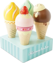 Set drvenih sladoleda HONEYBAKE brenda Le Toy Van pretvara svaku dječju sobu u malu slastičarnicu. Četiri različito ukrašene kugle na prirodnim kornetima ručno su oslikane ekološkim bojama na bazi vode i smještene na stilski stalak za pregledno izlaganje.