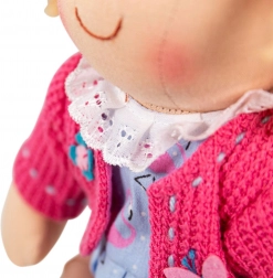 Tkanena lutka Maggie simpatična je pratiteljica za svakodnevnu igru i maženje. Zahvaljujući mekanom tijelu bez tvrdih dijelova sigurna je već za novorođenčad, a njezin prijateljski osmijeh djeca će zavoljeti na prvi pogled. Stajling čine ružičasti pleteni džemperić i plava haljina s motivom flamingosa, koji potiču maštu u igrama uloga.