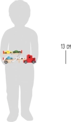 Priredite djeci realistčnu zabavu s drvenim auto-prikolicarom koji može prevesti četiri šarena sportska autića. Spojite prikolicu na tegljač, spustite gornju platformu i neka vozila udobno iziđu niz rampu. Prečka na podignutoj platformi sprječava neželjeno vraćanje unatrag – sve je spremno za duge i sigurne vožnje.