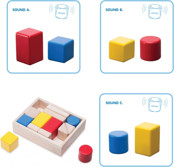 Ovaj kompaktan i precizno izrađen set kombinira 6 šarenih zveckajućih kocaka i 7 prirodnih kocaka. Djeca mogu uspoređivati i uparivati dijelove prema intenzitetu i karakteru zvuka, vježbati finu motoriku i logičko razmišljanje. Kutijica služi kao pametan organizator i istodobno kao izazov – vraćanje kocaka natrag zahtijeva domišljatost i prostornu predodžbu.