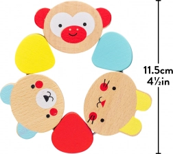 Drvena grickalica dizajnirana je tako da odgovara malim ručicama koje uživaju u sigurnom istraživanju različitih tekstura i oblika. Savršena je tijekom rasta prvih zubića zahvaljujući prirodnim materijalima i bojama na vodenoj bazi, što jamči sigurnost pri korištenju.