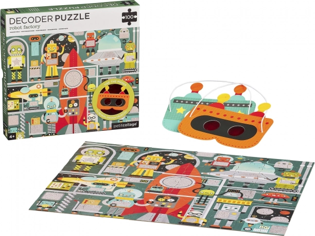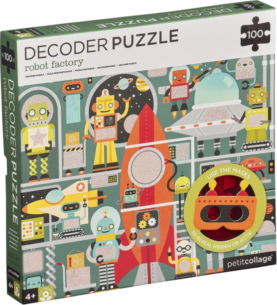 Zabavne dječje puzzle s motivom robotske tvornice brenda Petit Collage donose interaktivno iskustvo: nakon slaganja slike od 100 dijelova stavite posebnu masku i otkrijte skrivene objekte. Puzzle su izrađene od recikliranog papira i tiskane netoksičnim bojama s certifikatom FSC, idealne za djecu od 4 godine.