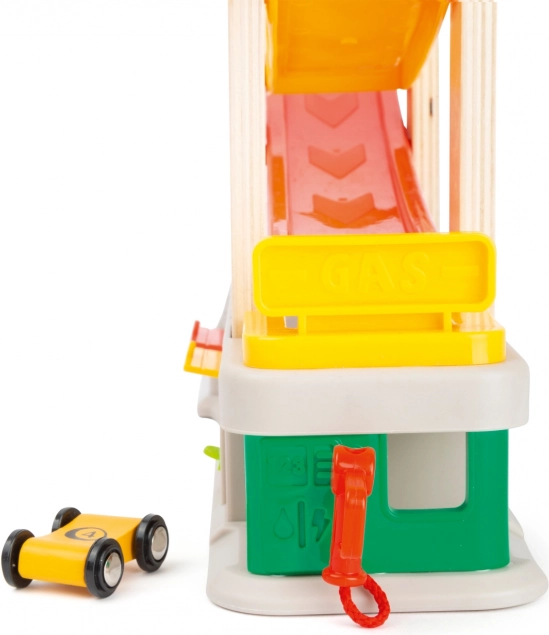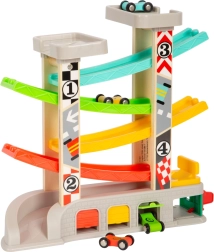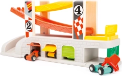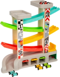 Staza je dizajnirana da razvija vještine imitativnog igranja i finih motoričkih sposobnosti, dok djeca utrkuju s četiri različito obojena autića. Osim toga, zahvaljujući praktičnom sustavu parkiranja i skladištenja, mali trkači mogu svoje autiće lako pospremiti nakon utrke.