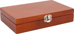 Ova kvalitetna drvena kutija djeluje kao malo putno kasino: dva puna špila karata (2×54 karata) i set kockica u preglednim pretincima uvijek su spremni za igru. Unutarnja zelena filcana podloga ublažava udar kockica i osigurava ugodan komfor pri igri, dok metalni zasun drži sve sigurno zatvorenim.