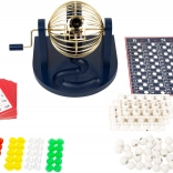 Ovaj kompletni Bingo set donosi sve za trenutnu igru: metalni bubanj za izvlačenje s ručkom, numerirane loptice, kartice i obojene žetone. Igrači postupno označuju izvučene brojeve na svojim karticama, a tko prvi sastavi horizontalan, vertikalan ili dijagonalan niz od pet, viče „BINGO!”.