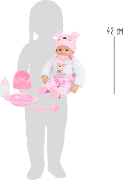 Bogati set dodataka uključuje dudu, bočicu, tanjurić sa priborom i kahlicu u usklađenim bojama. Djeca mogu vježbati hranjenje, presvlačenje i higijenske navike kroz zabavnu ulogovnu igru. Odjeća je dizajnirana za lako presvlačenje, pa je rukovanje lutkom jednostavno i malim ručicama.