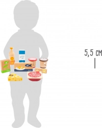 Set sadrži narančin sok, dva pakiranja sladoleda, pakiranje graška, riblje štapiće, maslac, sir, narezanu salamu i kutiju mlijeka. Realistični otisci i prirodan izgled privlače na prvi pogled. Zahvaljujući čvrstom drvu set je izdržljiv i spreman za svakodnevnu igru.