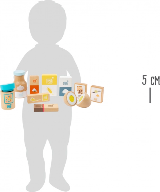 Razvijte maštu malih pekara s ovim setom drvenih dodataka od 10 dijelova brenda small foot. Sadrži sve potrebno za igru pečenja: brašno, šećer, vrhnje, sol, prašak za pecivo, vanilin šećer te rastavljivo jaje. Odlično nadopunjuje dječju kuhinju, potiče igru uloga i razvoj fine motorike.