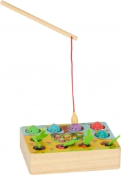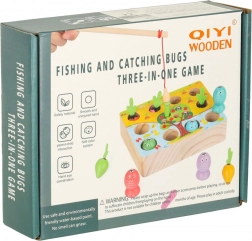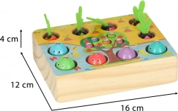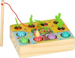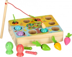 Zabavna drvena montessori igra uz koju djeca mogu uživati u “ribolovu” i vrtlarenju kod kuće. Pomoću magnetskog štapa love ribice i crviće, a mrkvice izvlače za filcane listiće. Razvija finu motoriku, koordinaciju oko–ruka, strpljenje i preciznost, učenje boja i taktilnu percepciju. Izrađeno od kvalitetnog drva s sigurnom netoksičnom bojom.