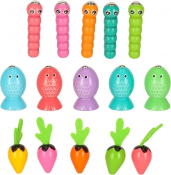 - 5× mrkvica, 5× crvić, 5× ribica, 1× magnetski štap, drvena baza